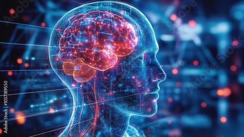 Brainmapping hologram showing the impact of bioengineered neural enhancements, bioengineering, cognitive advancements