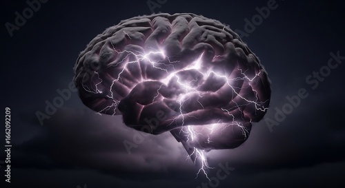 Brainstorming graphic. Powerful brain with lightning strikes, mental energy. Use for neurology, mental health, innovation, ideas, artificial intelligence concept, education.