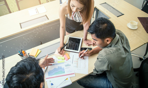 Brainstorming Group of people Working Concept. Business team brainstorming. Marketing plan researching. Paperwork on the table, laptop and mobile phone.
