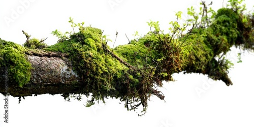 Branch covered with vibrant green moss on a white background, isolated for design elements.