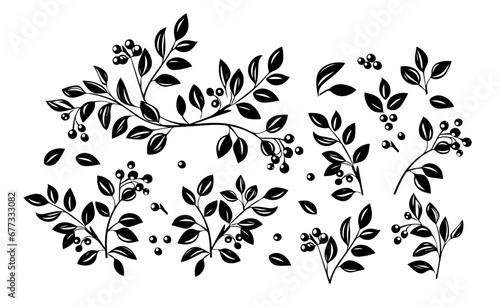 Branch, leaves black silhouettes set. Isolated on white background hand drawn. Not AI . Vector illustration