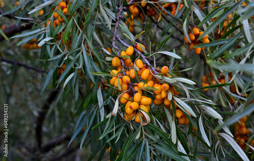 branch of seabuckthorn bush with cluster of orange berries close up