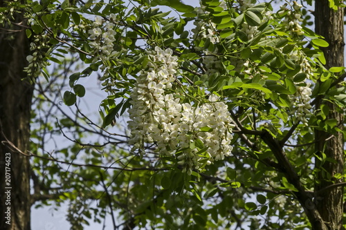 Branch with fresh bloom of acacia-tree or common locust flower in park, Sofia, Bulgaria