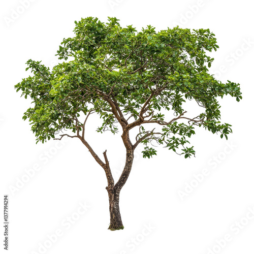 Branch with lush green leaves extending from a large tree against a white background, Isolated image a branch with leaves a large tree on a white background
