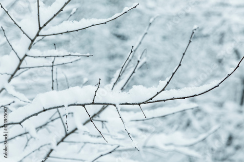 Branches of trees under the thickness of snow. A beautiful winter fairy tale. Close-up.