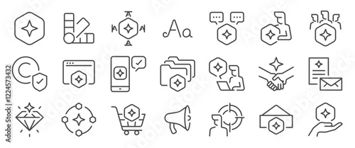 Brand identity icon set. It includes logo, design, unique, color, typography, and more icons. Editable Vector Stroke.
