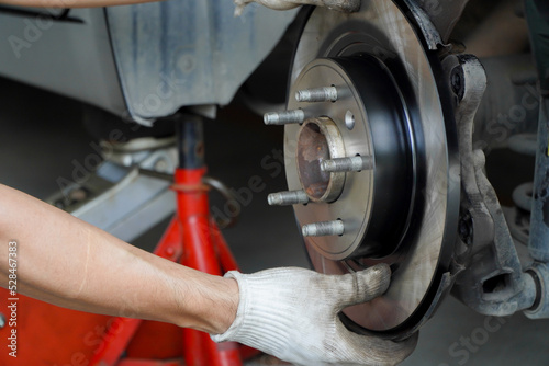 Brand new brake discs for garage cars. Auto mechanic,in process of new tire replacement, Car brake repairing in garage