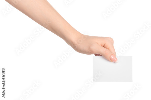 Branding and advertising theme: beautiful female hand holding a blank white paper card isolated on white background