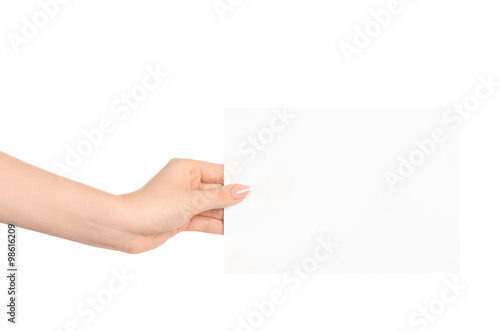 Branding and advertising theme: beautiful female hand holding a blank white paper card isolated on white background