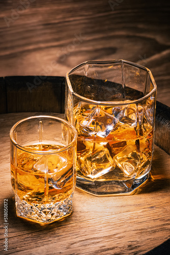 Brandy and whiskey in glasses with ice close-up on wooden barrel, vertical format. Whiskey and cognac in stacks of ice stand on wooden barrel against background of wooden wall.