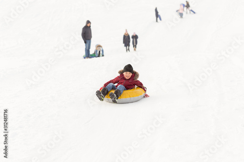 Brave child in red jackets, a trip in the winter from the mountains to tubing. He has an inflatable chamber. It slides quickly through the snow.