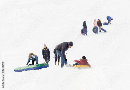 Brave child in red jackets, a trip in the winter from the mountains to tubing. He has an inflatable chamber. It slides quickly through the snow.