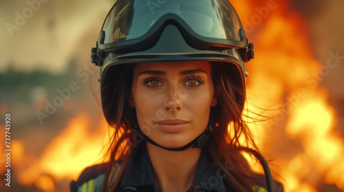 Brave Female Firefighter in Helmet with Blazing Fire Background
