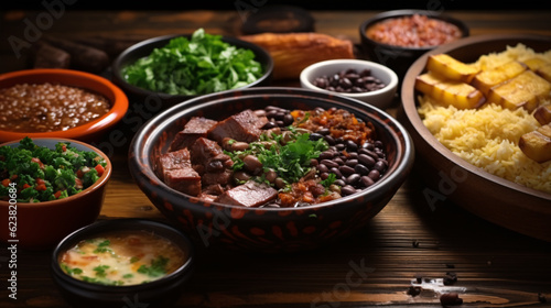 Brazilian Feijoada Food. Top view, South American cuisine. Food design. Ingredients and bowl.