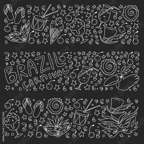 Brazilian vector pattern with palm, beach, sea, carnival. Brazil icons for posters and banners.