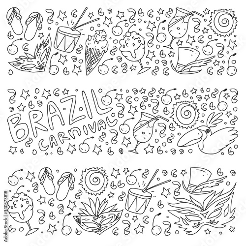 Brazilian vector pattern with palm, beach, sea, carnival. Brazil icons for posters and banners.