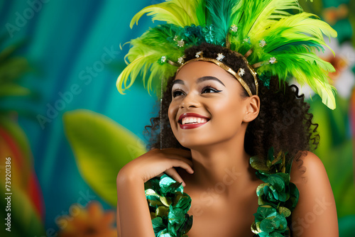 Brazilian woman in vibrant Carnival costume, pondering adventures.