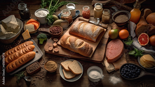 bread, fruit, and other foods on a wooden cutting board in the photo is overlaided with food
