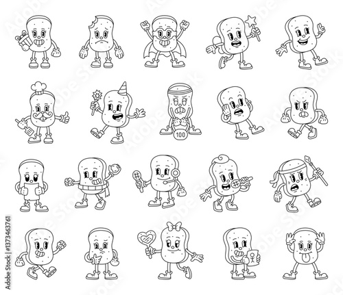 Bread toast character set includes a variety of fun illustrations showing emotions, outfits, and pose in a cute vintage cartoon food themed style for yours creative projects