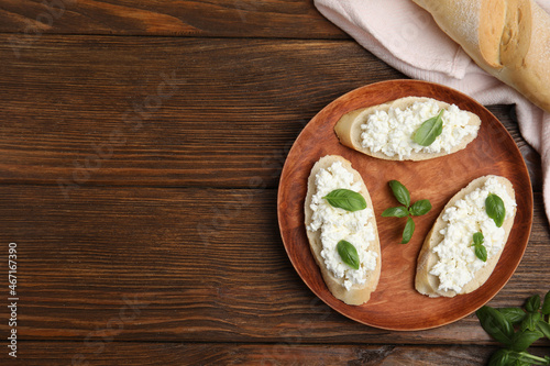 Bread with cottage cheese and basil on wooden table, flat lay. Space for text