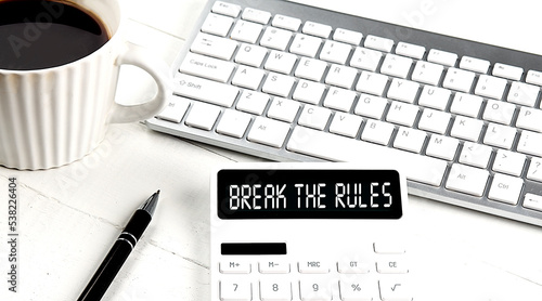 BREAK THE RULES text on calculator with keyboard and coffee