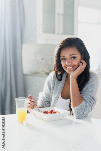 Breakfast, cereal and portrait of woman with orange juice in home with benefits of nutrition in diet. Happy, girl and bowl of granola muesli with fruit and eating for gut health or digestion of food