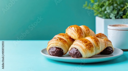 Breakfast featuring mini fresh croissant buns filled with chocolate and a coffee cup on a blue turquoise backdrop Ample copy space available