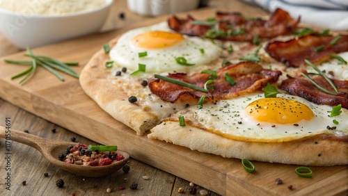 Breakfast pizza topped with crispy bacon and sunny-side-up eggs ready to savor on a wooden board