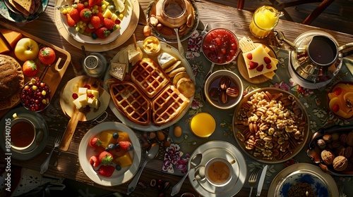 breakfast table full of various dishes. Belgian waffles, jam, nuts, fresh juice, sliced fruits, cheese platter, and a pot of hot coffee on breakfast table