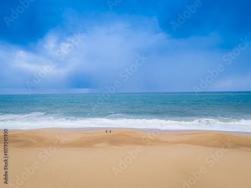 Breaking waves at Nazare beach on the Portugal coastal town on the Atlantic ocean shore. Aerial drone view