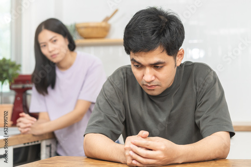 Breakup and depressed, asian young quarrel couple love fight relationship in trouble. Different people are emotion angry. Argue husband has expression, upset with wife. Problem of family people.