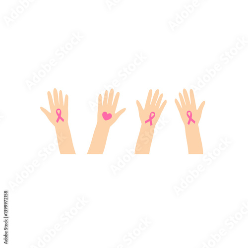 Breast cancer awareness hands. Human hands with pink ribbons support symbol.