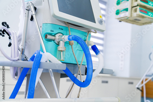 Breathing hoses on critical care machine. Detail of flexible ventilator tubing and connectors in hospital ward