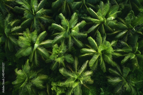 Breathtaking aerial view captures the vibrant green tones and natural patterns of a dense palm tree forest