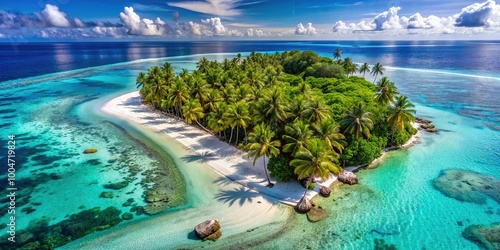 Breathtaking aerial view of a serene tropical island with powdery white sandy beach, swaying palm trees, and crystal-clear turquoise water surrounded by coral reef.