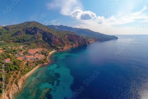 Breathtaking aerial view of Kefalonia Ionian Sea coast showcasing pristine nature and vibrant landscapes, Ionian sea coast nature aerial panorama Kefalonia island, Assos village