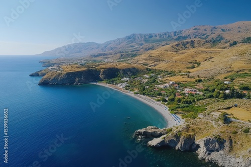 Breathtaking aerial view of Preveli Beach in Crete reveals stunning coastline and crystal-clear waters, Aerial view of Preveli Beach, Crete, Greece