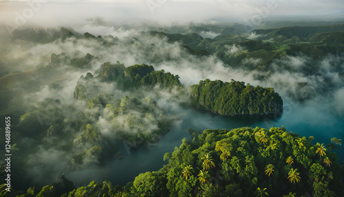 Breathtaking aerial view of the Amazon rainforest covered in mist, with winding rivers creating a mystical atmosphere.