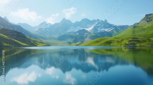 Breathtaking aerial view showcases a mountain lake mirroring surrounding peaks on a sunny day. Green hills and crystal-clear water create a serene, picturesque landscape inviting exploration