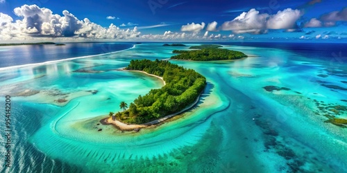 Breathtaking, aerial wave shot above turquoise lagoon, showcasing tranquil, untouched island, and subtle wave patterns, with high-contrast, vivid colors.