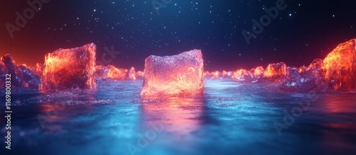 Breathtaking and otherworldly scene of a frozen seascape with glowing crystalline rock formations emerging from the still reflective waters under a captivating starry night sky This surreal