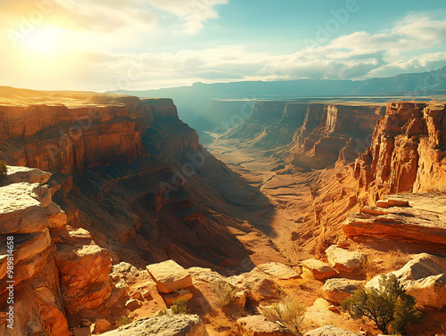 Breathtaking canyon view at sunset with vibrant colors and dramatic cliffs under the blue sky.