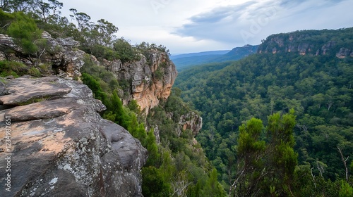 Breathtaking Cliffside View Overlooking Expansive Forested Valley in Untouched Wilderness : Generative AI