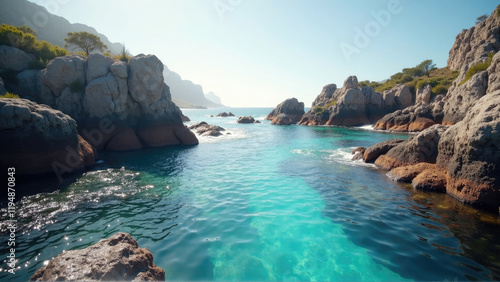 Breathtaking coastal landscape featuring clear turquoise waters and rocky cliffs under bright sunny skies