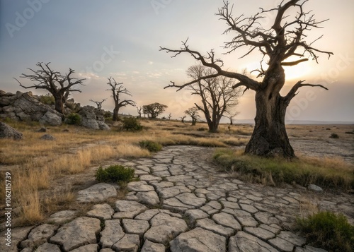 Breathtaking Desolate Landscape with Cracked Earth and Twisted Leafless Trees Under Dramatic Sky