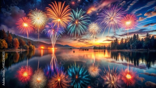 Breathtaking Fireworks Reflection on Serene Lake at Night