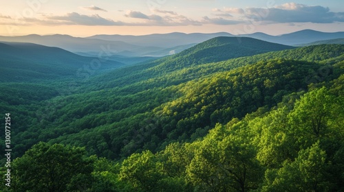 Breathtaking forested mountains at sunrise with lush greenery and rolling hills