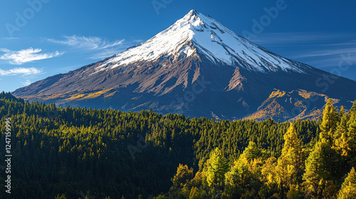 Breathtaking mountain landscape featuring snow capped peak surrounded by dense green forests and autumn foliage, showcasing nature beauty and tranquility
