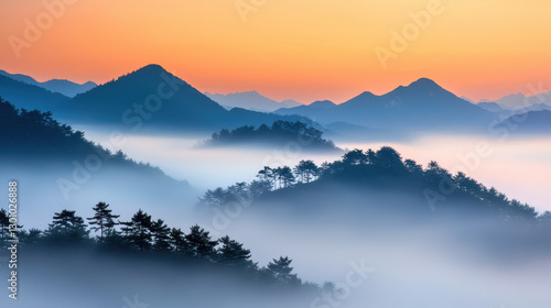 Breathtaking mountain landscape with mist and sunrise colors , Korean Pine Concept
