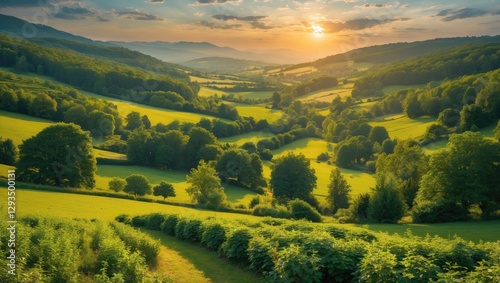 Breathtaking Panoramic Landscape at Sunset with Lush Green Fields and Rolling Hills Under a Colorful Sky